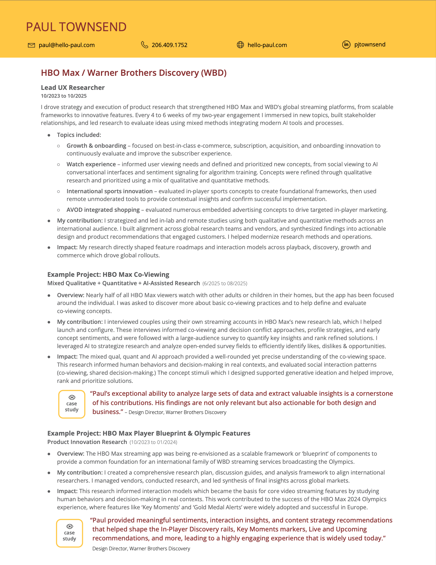 Paul is also a dedicated team builder. He helped support a culture of curiosity and rigor, and I’ve watched him informally coach other researchers to level up their skills and impact. Paul is a research leader who elevates the entire product organization, and I highly recommend him for any UX research role.”